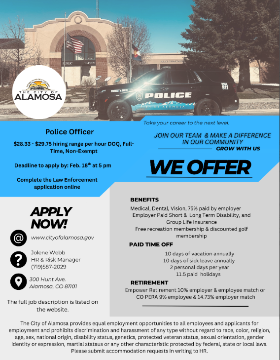 Please send resume or application to louis@rmhhs.com by May 24th 2024. Applications are available at 616 Main Street, Alamosa, Colorado 81101