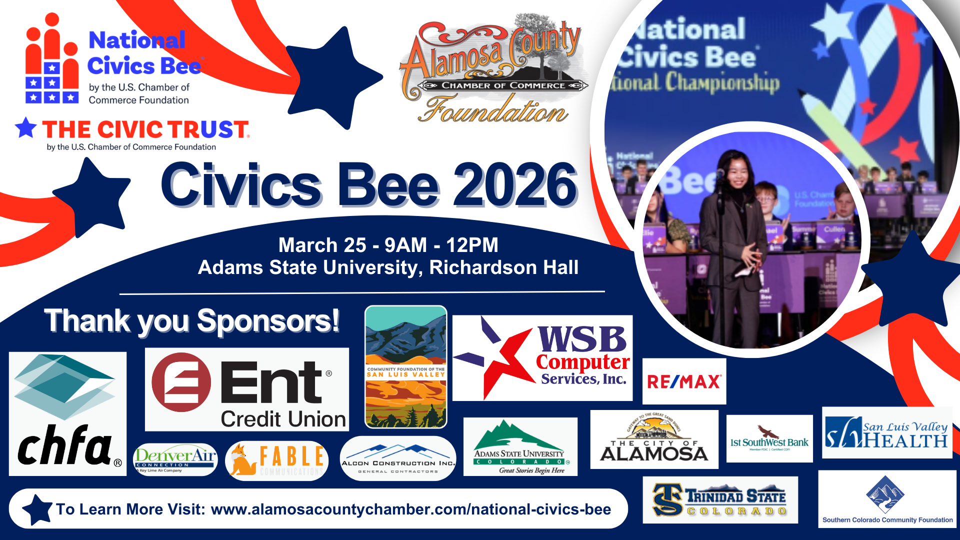 The Alamosa County Chamber Foundation is partnering with the U.S. Chamber of Commerce Foundation to host a nonpartisan civics competition that encourages young Americans to engage in civics and contribute to their communities. Participating 6th, 7th and 8th graders will flex their civics knowledge for a chance to win recognition and cash prizes. Finalists will be invited to Washington, DC to compete in the National Civics Bee National Championship in Fall 2026.